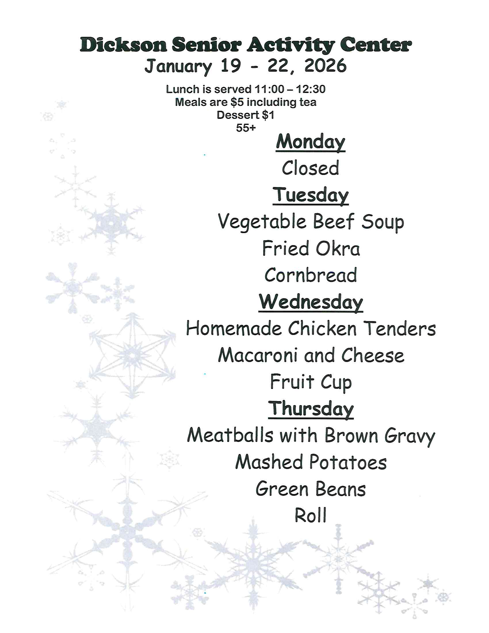 - The Dickson Senior Activity Center is a “multi-purpose center” and is considered the “Community Focal Point” for services for adult seniors 55 or older. Several activities are offered throughout each month, and are listed in our monthly newsletter, which can be picked up at the Center, on Facebook, or at the top of this page under the Monthly Newsletter button.